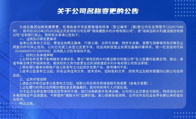2022年9月,原湖南建工集團與原湖南交水建集團合并組建湖南建設(shè)投資集團。原雙方集團旗下的湖南百舸水利建設(shè)股份有限公司和湖南建工集團水利水電工程公司合并為湖南建投百舸水利公司,實行兩塊牌子(百舸水利、建工水利)管理,為湖南建投集團唯一水利建設(shè)企業(yè)。2024年9月,公司正式更名為湖南建投水利水電有限公司(簡稱湖南建投水利),統(tǒng)籌管理“百舸水利”“建工水利”“施工公司”“疏浚公司”等子品牌。